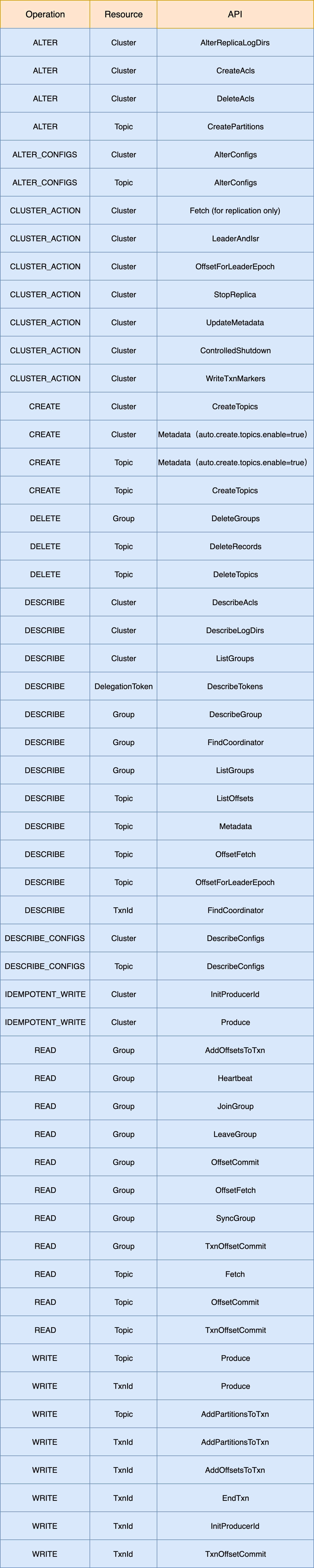 - Operation:表示一个具体的访问类型,如读写消息或创建主题等。