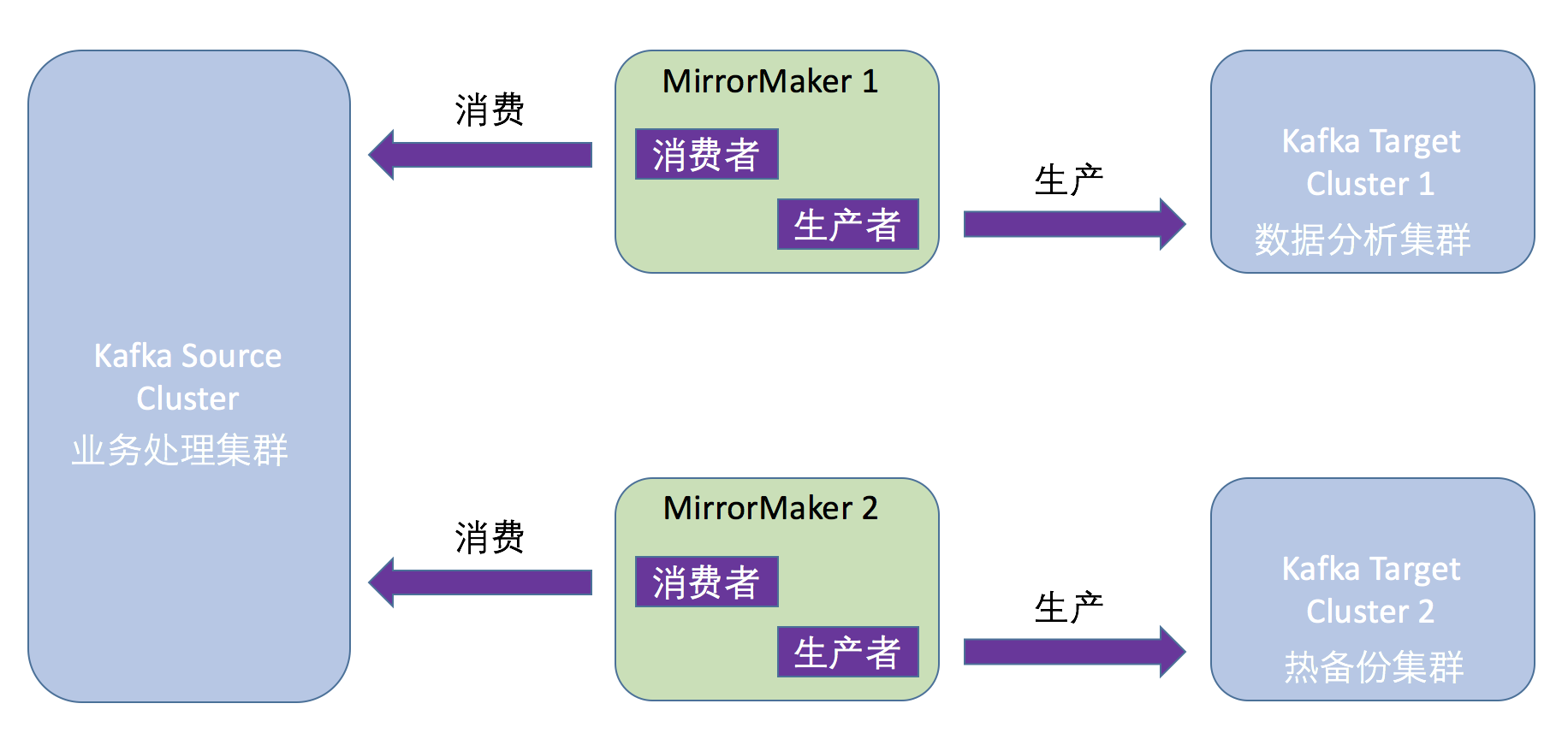 MirrorMaker 连接的源集群和目标集群,会实时同步消息。当然,你不要认为你只能使用一套 MirrorMaker 来连接上下游集群。事实上,很多用户会部署多套集群,用于实现不同的目的。
