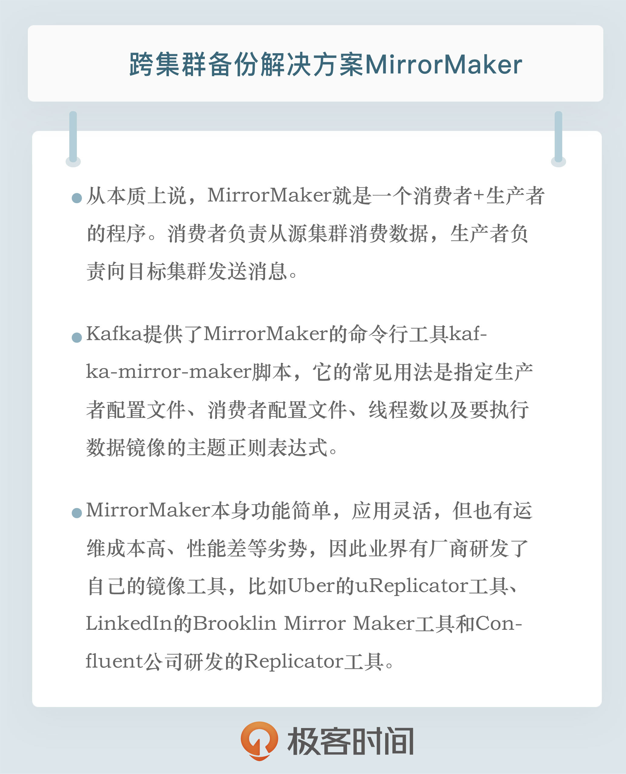 好了,我们总结一下今天所讲的 MirrorMaker。它是 Apache Kafka 社区提供的跨集群镜像解决方案,主要实现将 Kafka 消息实时从一个集群同步复制或镜像到另一个集群。你可以把 MirrorMaker 应用到很多实际的场景中,比如数据备份、主备集群等。MirrorMaker 本身功能简单,应用灵活,但也有运维成本高、性能差等劣势,因此业界有厂商研发了自己的镜像工具。你可以根据自身的业务需求,选择合适的工具来帮助你完成跨集群的数据备份。
