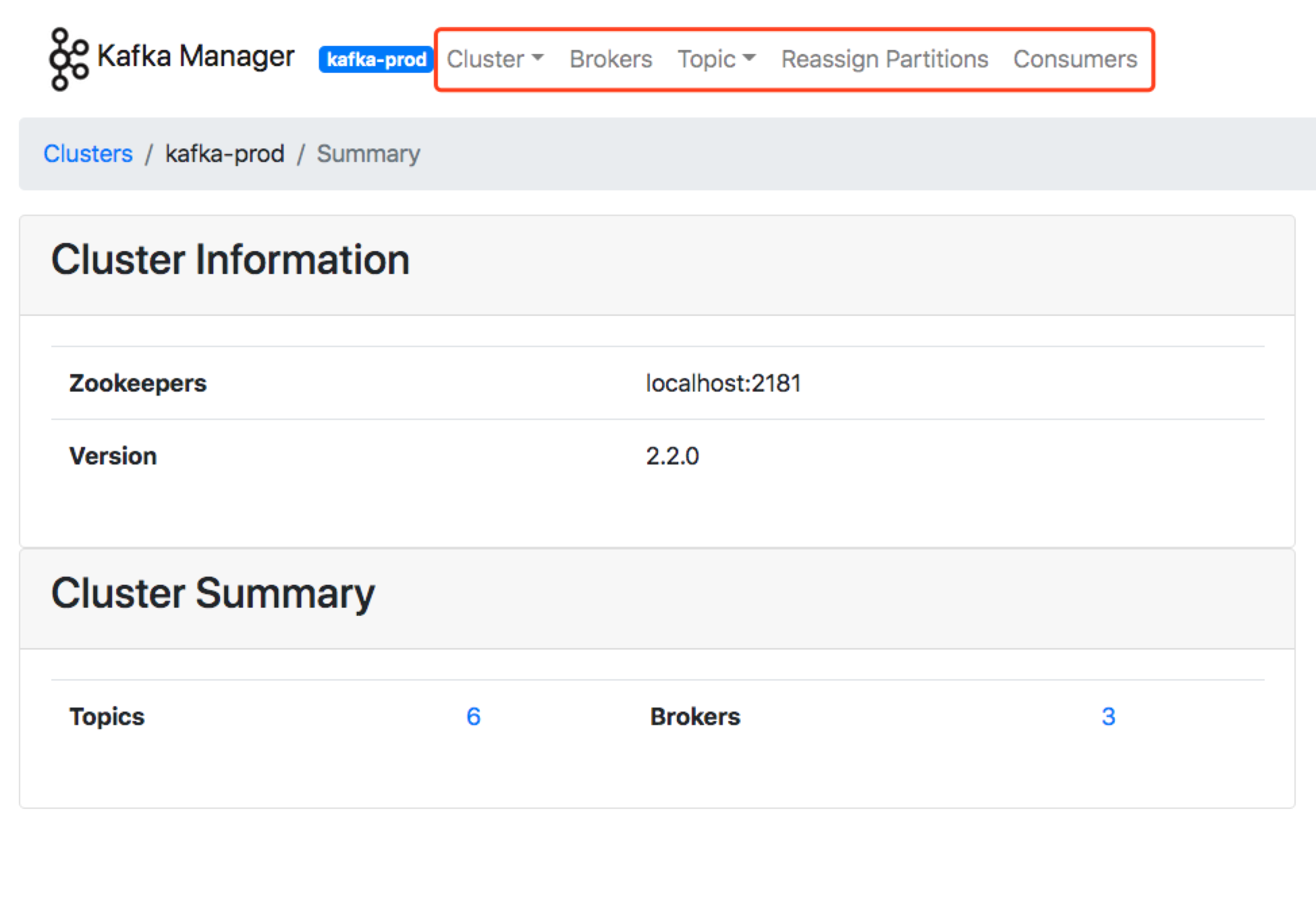 从这张图中,我们可以发现,Kafka Manager 清晰地列出了当前监控的 Kafka 集群的主题数量、Broker 数量等信息。你可以点击顶部菜单栏的各个条目去探索其他功能。