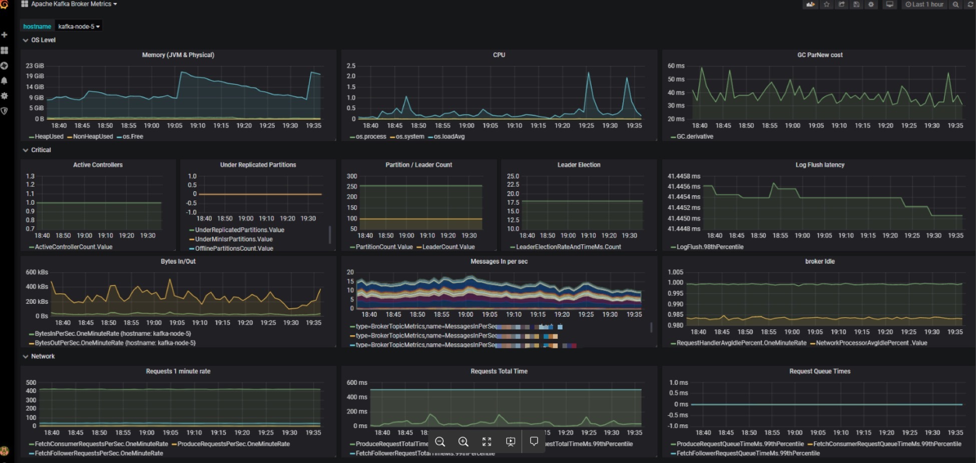 我们来看一张生产环境中的监控截图。图中集中了很多监控指标,比如 CPU 使用率、GC 收集数据、内存使用情况等。除此之外,这个仪表盘面板还囊括了很多关键的 Kafka JMX 指标,比如 BytesIn、BytesOut 和每秒消息数等。将这么多数据统一集成进一个面板上直观地呈现出来,是这套框架非常鲜明的特点。