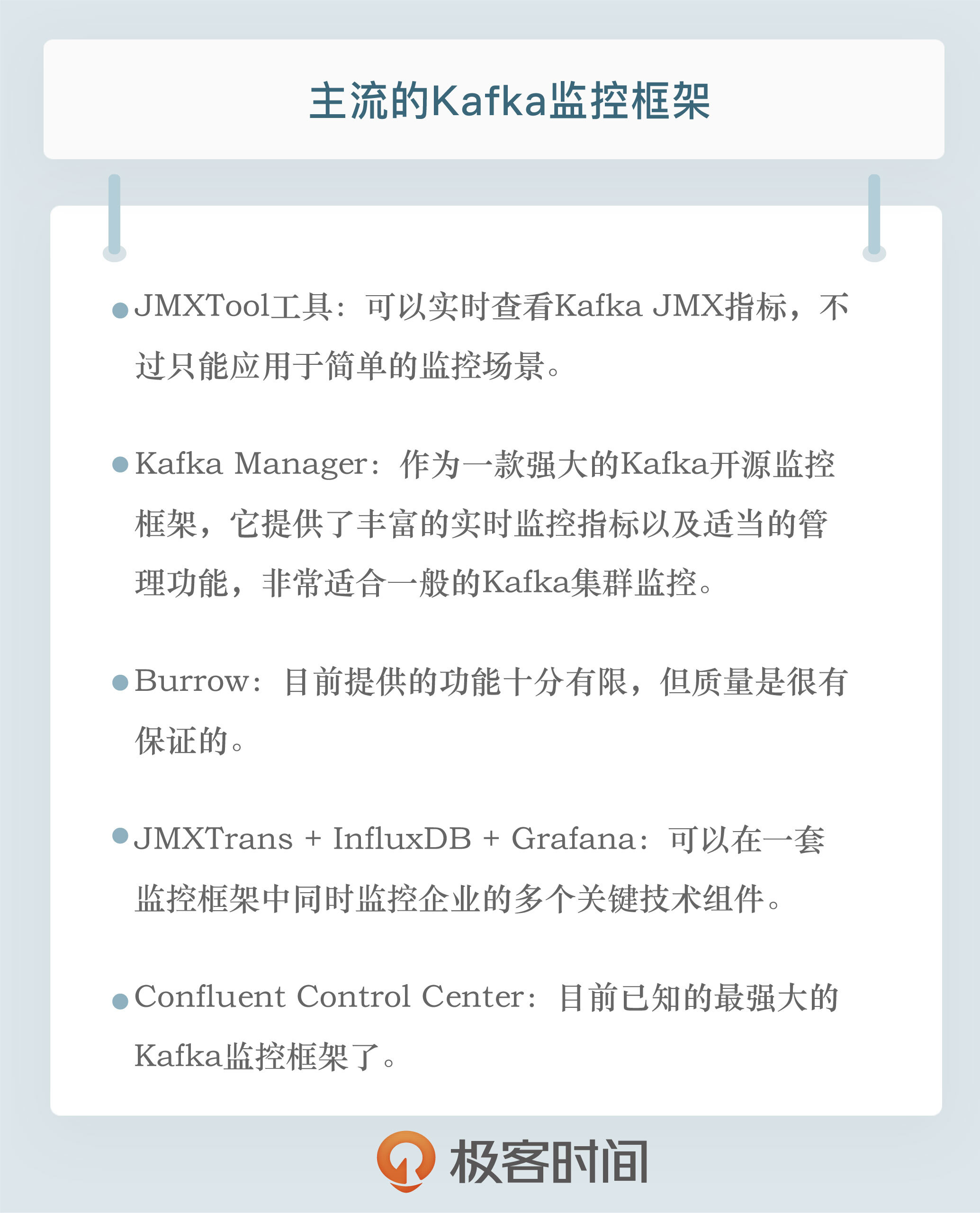 其实,除了今天我介绍的 Kafka Manager、Burrow、Grafana 和 Control Center 之外,市面上还散落着很多开源的 Kafka 监控框架,比如 Kafka Monitor、Kafka Offset Monitor 等。不过,这些框架基本上已经停止更新了,有的框架甚至好几年都没有人维护了,因此我就不详细展开了。如果你是一名开源爱好者,可以试着到开源社区中贡献代码,帮助它们重新焕发活力。