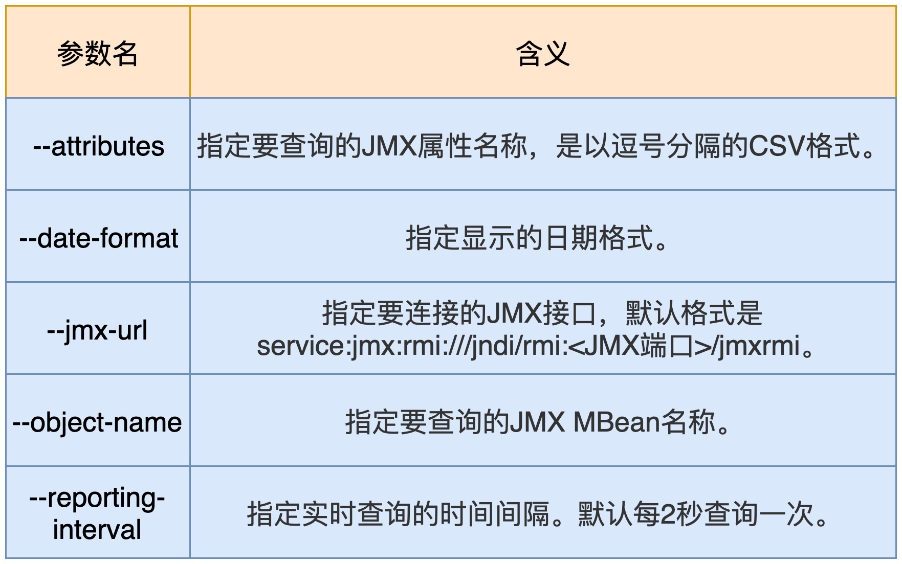 JMXTool 工具提供了很多参数,但你不必完全了解所有的参数。我把主要的参数说明列在了下面的表格里,你至少要了解一下这些参数的含义。