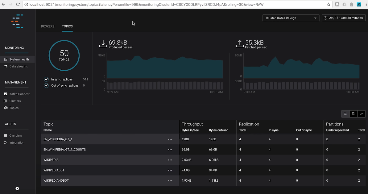 Control Center 不但能够实时地监控 Kafka 集群,而且还能够帮助你操作和搭建基于 Kafka 的实时流处理应用。更棒的是,Control Center 提供了统一式的主题管理功能。你可以在这里享受到 Kafka 主题和 Schema 的一站式管理服务。