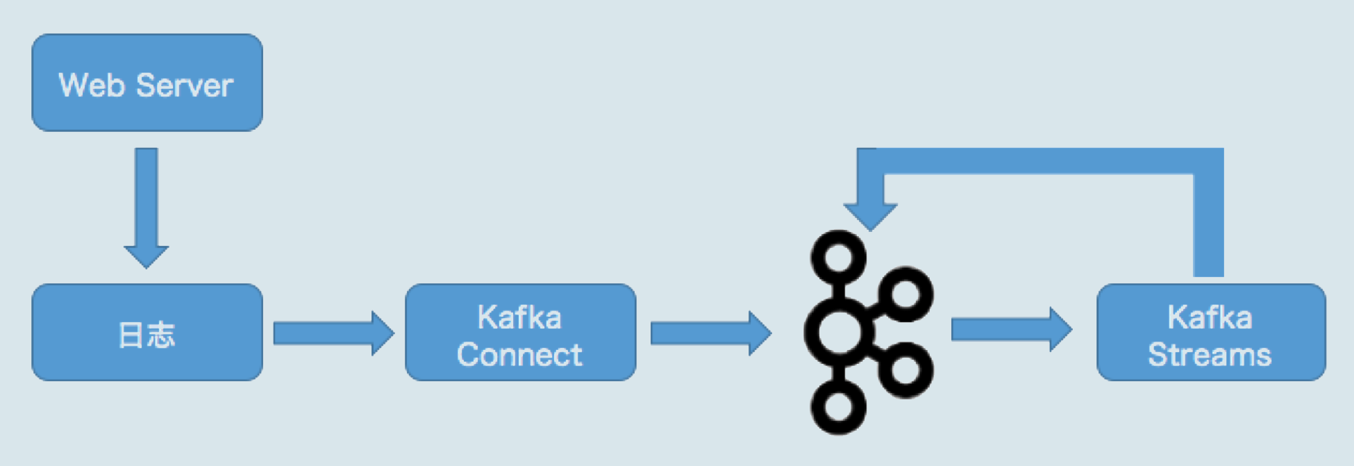 从图中我们可以看到,日志先从 Web 服务器被不断地生产出来,随后被实时送入到 Kafka Connect 组件,Kafka Connect 组件对日志进行处理后,将其灌入 Kafka 的某个主题上,接着发送到 Kafka Streams 组件,进行实时分析。最后,Kafka Streams 将分析结果发送到 Kafka 的另一个主题上。