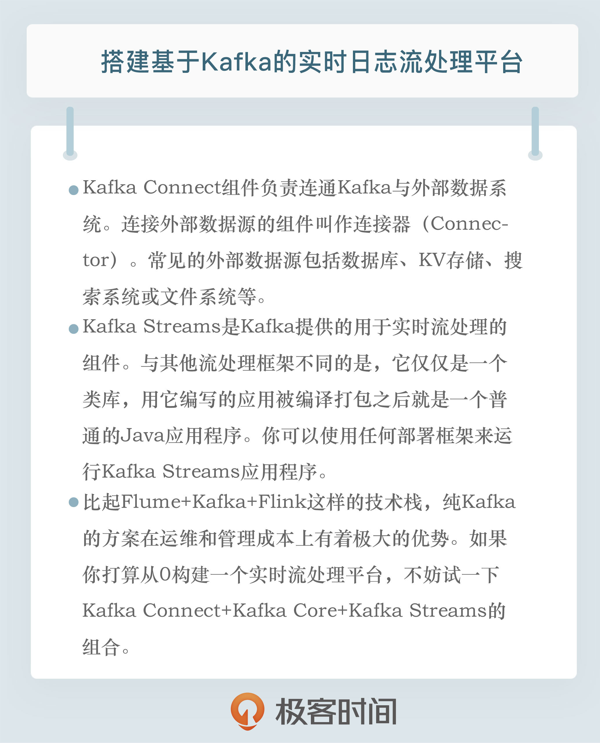 我在专栏前面简单介绍过 Kafka Connect 和 Kafka Streams 组件,前者可以实现外部系统与 Kafka 之间的数据交互,而后者可以实时处理 Kafka 主题中的消息。