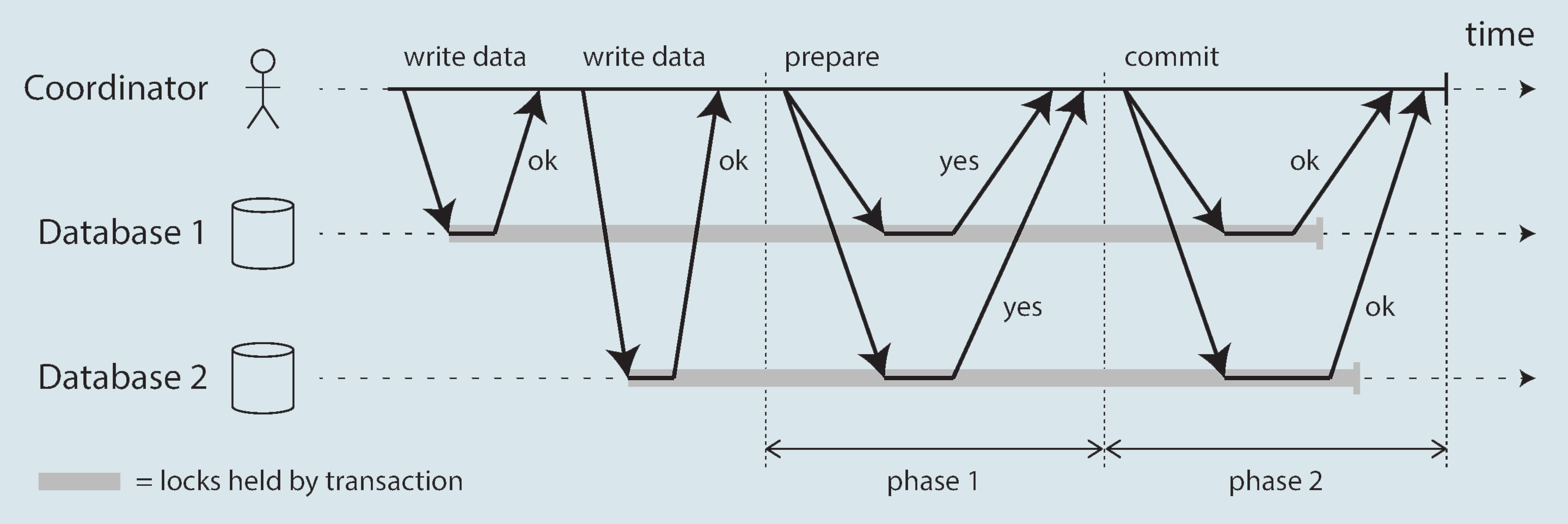 两阶段提交(2-Phase Commit,2PC)机制是一种分布式事务机制,用于实现分布式系统上跨多个节点事务的原子性提交。下面这张图来自于神书“Designing Data-Intensive Applications”中关于 2PC 讲解的章节。它清晰地描述了一次成功 2PC 的过程。在这张图中,两个数据库参与到分布式事务的提交过程中,它们各自做了一些变更,现在需要使用 2PC 来保证两个数据库的变更被原子性地提交。如图所示,2PC 被分为两个阶段:Prepare 阶段和 Commit 阶段。只有完整地执行了这两个阶段,这个分布式事务才算是提交成功。