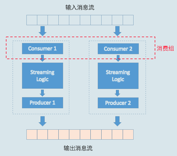 我画了一张图来展示每个 Kafka Streams 实例内部的构造,从这张图中,我们可以看出,每个实例都由一个消费者实例、特定的流处理逻辑,以及一个生产者实例组成,而这些实例中的消费者实例,共同构成了一个消费者组。