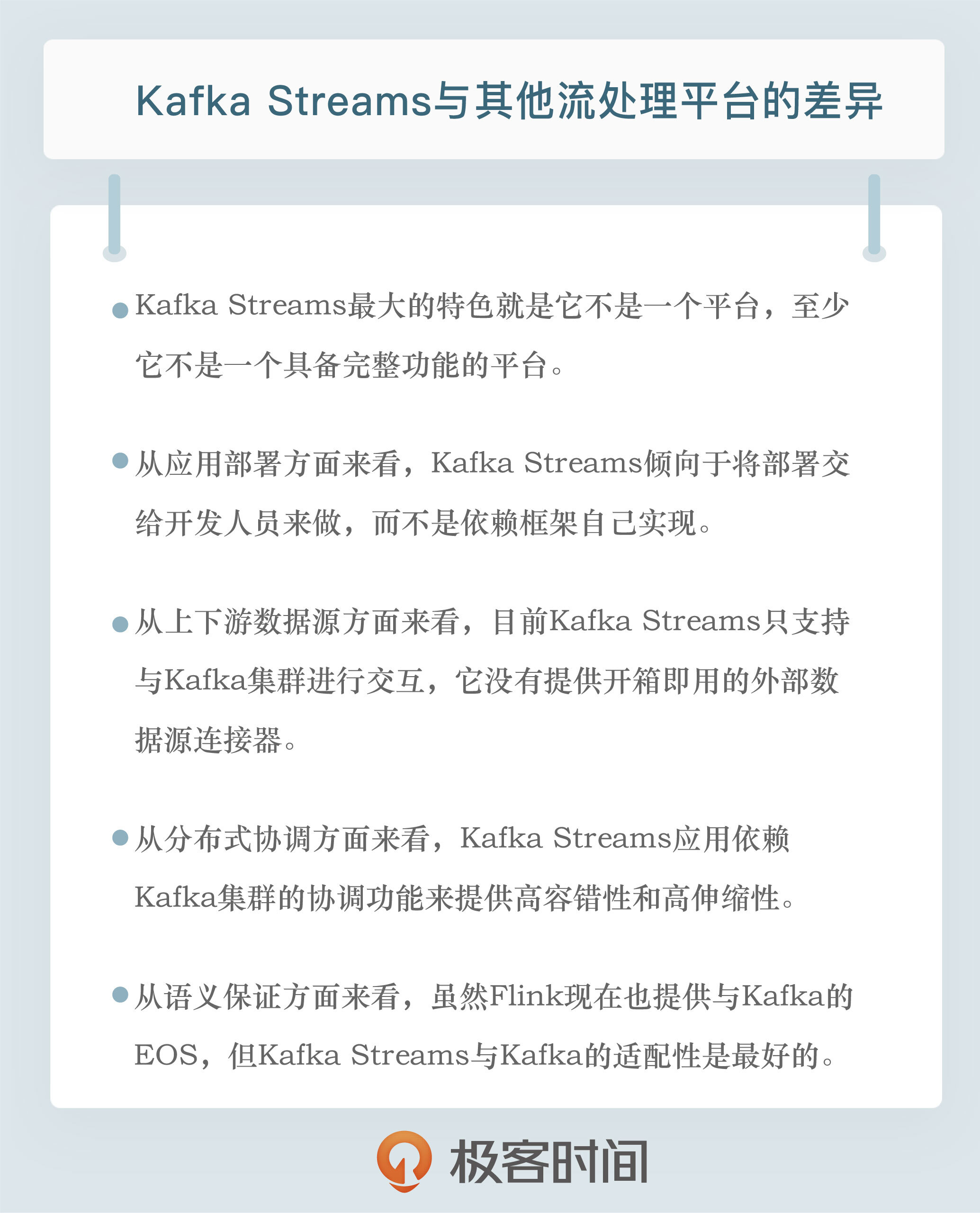 相比于其他流处理平台,Kafka Streams 最大的特色就是它不是一个平台,至少它不是一个具备完整功能(Full-Fledged)的平台,比如其他框架中自带的调度器和资源管理器,就是 Kafka Streams 不提供的。