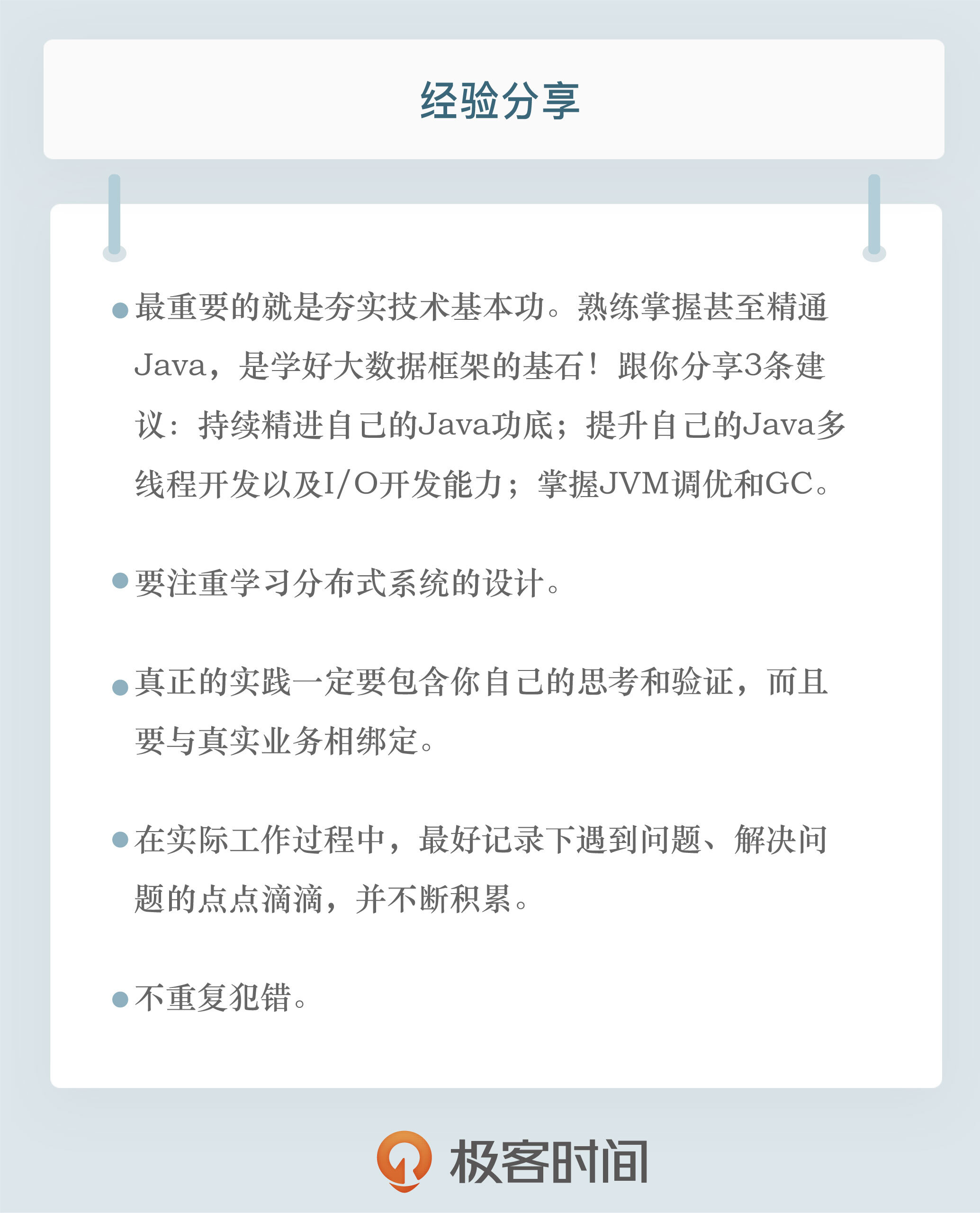 目前,大数据框架多是以 Java 或 JVM 系语言开发而成的,因此,熟练掌握甚至精通 Java,是学好大数据框架的基石!所谓精通,不仅仅是要求你熟练使用 Java 进行代码开发,更要求你对 JVM 底层有详细的了解。就这个层面的学习而言,我想给你 3 条建议。