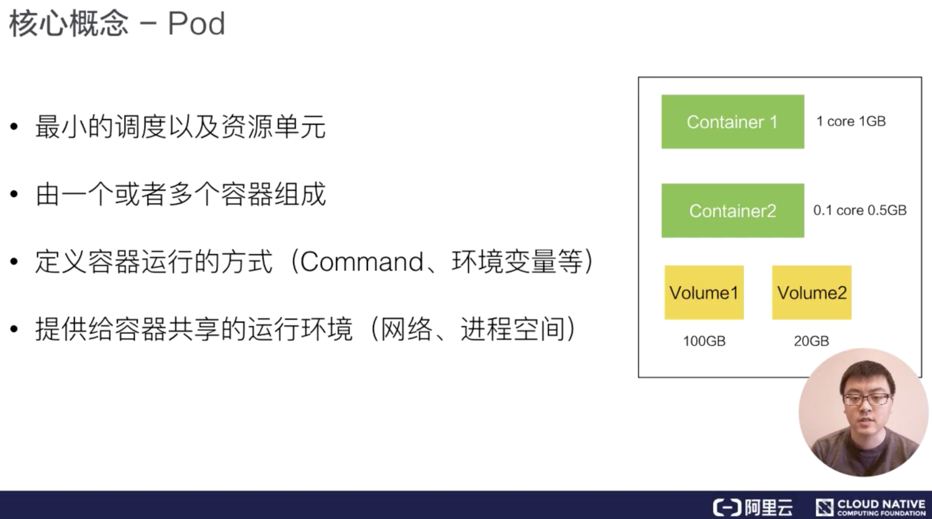 当然在这个 Pod 中也可以包含一些其他所需要的资源:比如说我们所看到的 Volume 卷这个存储资源;比如说我们需要 100 个 GB 的存储或者 20GB 的另外一个存储。