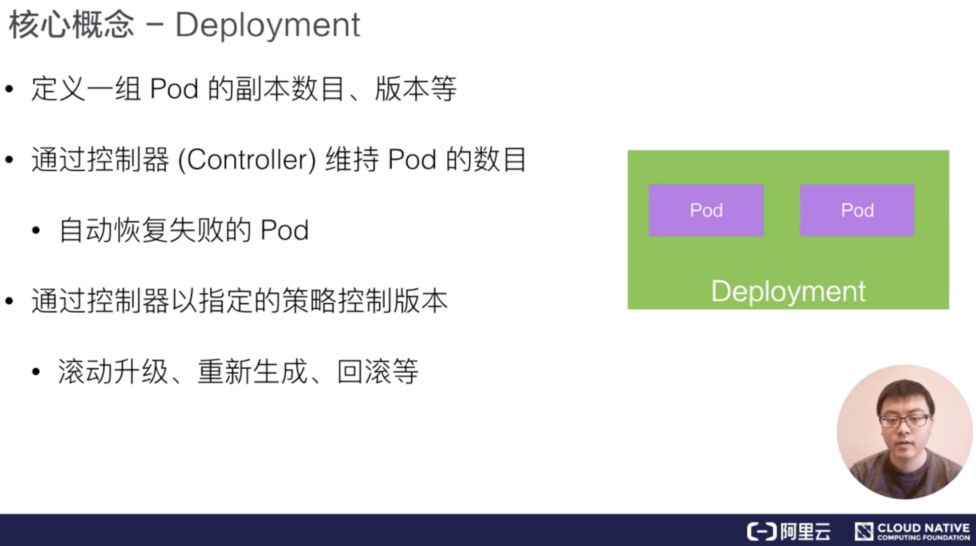 比如说我可以定义一个 Deployment,这个 Deployment 里面需要两个 Pod,当一个 Pod 失败的时候,控制器就会监测到,它重新把 Deployment 中的 Pod 数目从一个恢复到两个,通过再去新生成一个 Pod。通过控制器,我们也会帮助完成发布的策略。比如说进行滚动升级,进行重新生成的升级,或者进行版本的回滚。