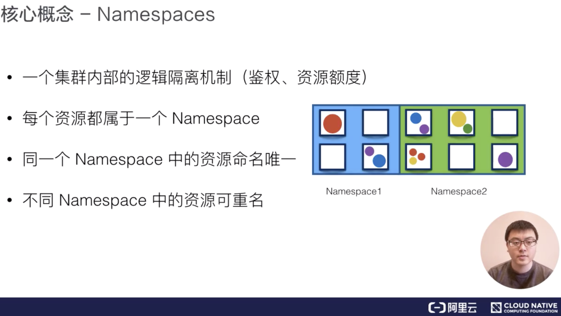 Namespace 一个用例,比如像在阿里巴巴,我们内部会有很多个 business units,在每一个 business units 之间,希望有一个视图上的隔离,并且在鉴权上也不一样,在 cuda 上面也不一样,我们就会用 Namespace 来去给每一个 BU 提供一个他所看到的这么一个看到的隔离的机制。