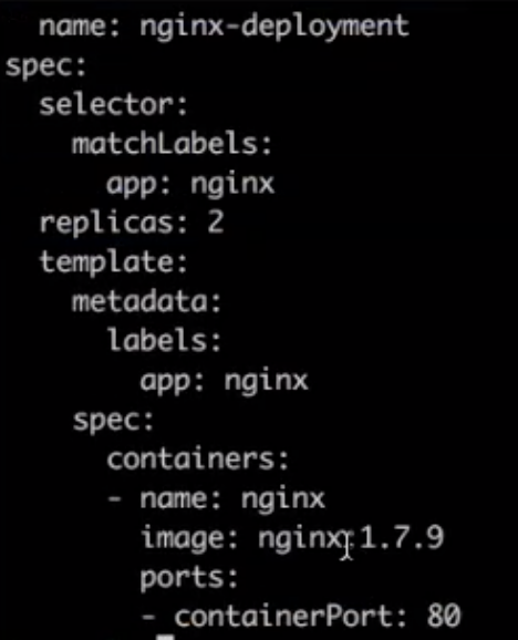 比较重要的一个部分叫做 Spec,Spec 也就是我们希望 Pod 达到的一个预期的状态。比如说它内部需要有哪些 container 被运行;比如说这里面有一个 nginx 的 container,它的 image 是什么?它暴露的 port 是什么?