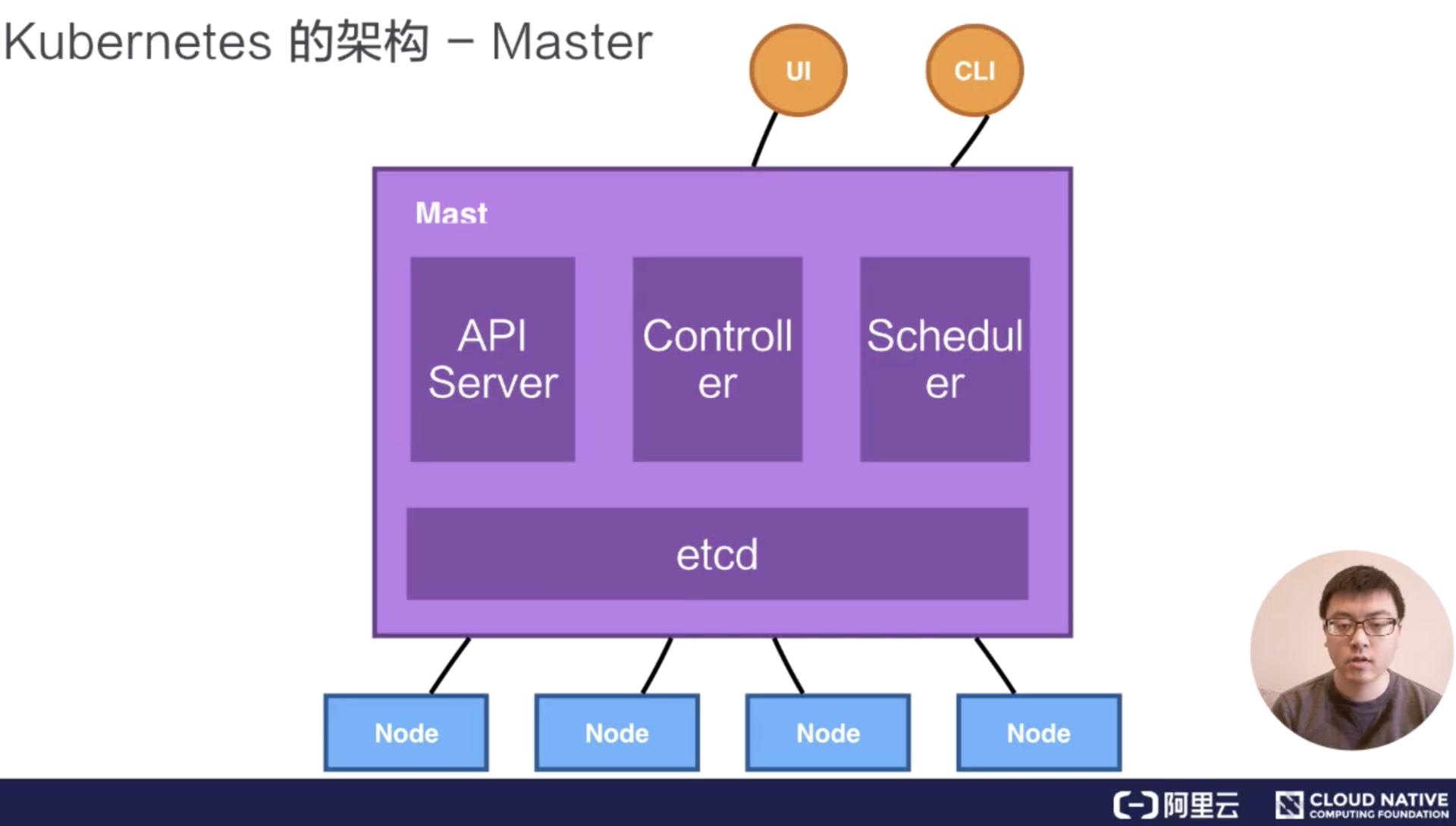 Kubernetes 的 Master 包含四个主要的组件:API Server、Controller、Scheduler 以及 etcd。如下图所示: