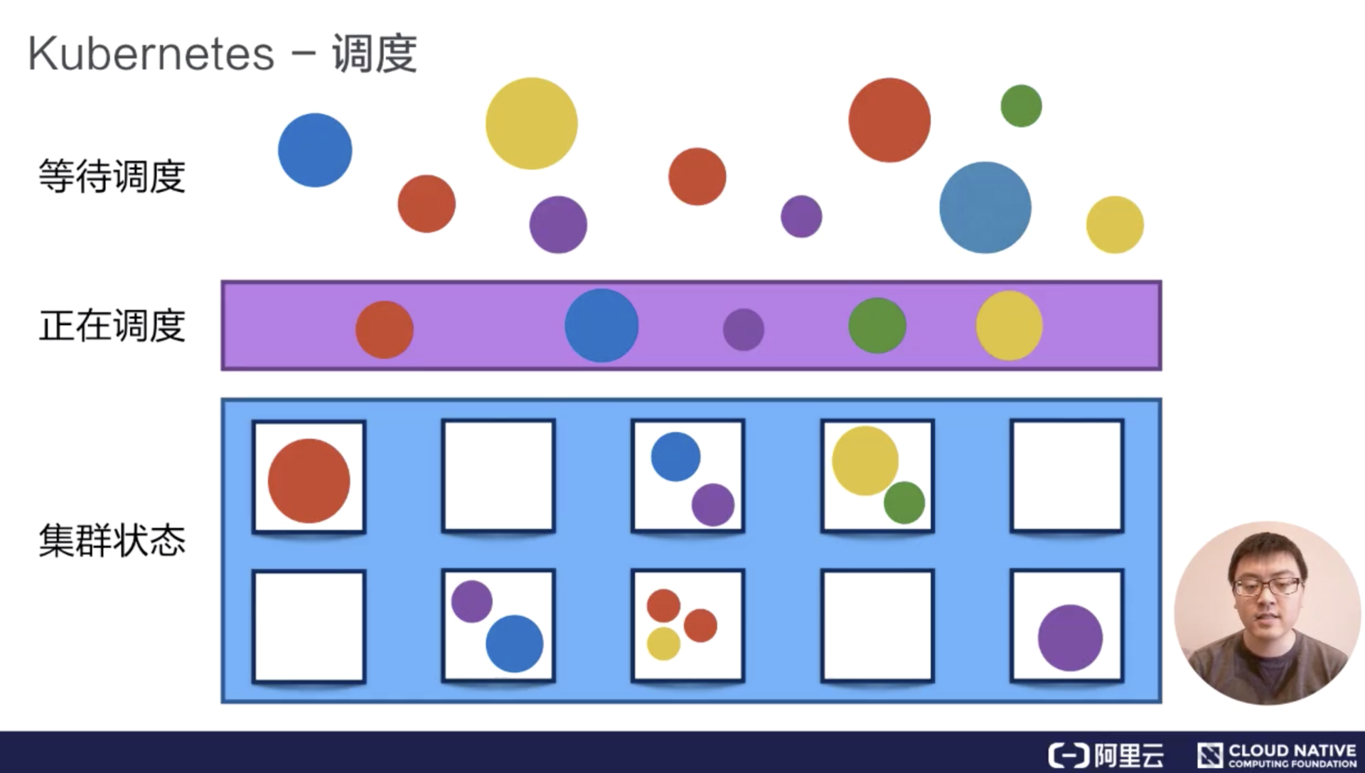 Kubernetes 可以把用户提交的容器放到 Kubernetes 管理的集群的某一台节点上去。Kubernetes 的调度器是执行这项能力的组件,它会观察正在被调度的这个容器的大小、规格。