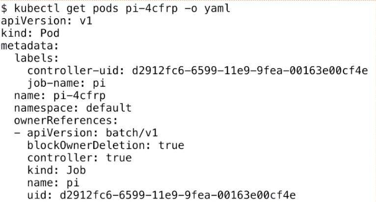 它比普通的 Pod 多了一个叫 ownerReferences,这个东西来声明此 pod 是归哪个上一层 controller 来管理。可以看到这里的 ownerReferences 是归 batch/v1,也就是上一个 Job 来管理的。这里就声明了它的 controller 是谁,然后可以通过 pod 返查到它的控制器是谁,同时也能根据 Job 来查一下它下属有哪些 Pod。