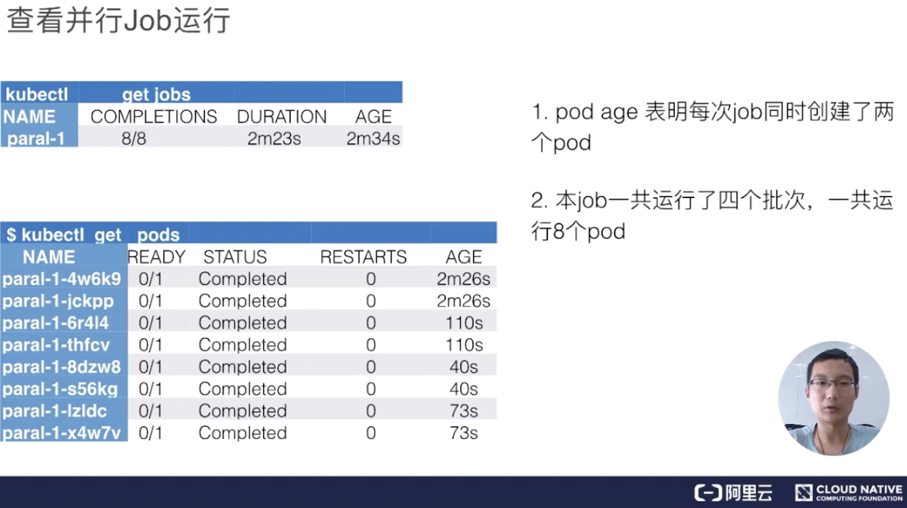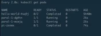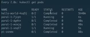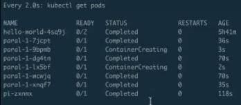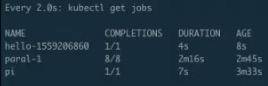 接着来看真正的 pods,pods 总共出来了 8 个 pod,每个 pod 的状态都是完成的,然后来看一下它的 AGE,就是时间。从下往上看,可以看到分别有 73s、40s、110s 和 2m26s。每一组都有两个 pod 时间是相同的,即:时间段是 40s 的时候是最后一个创建、 2m26s 是第一个创建的。也就是说,总是两个 pod 同时创建出来,并行完毕、消失,然后再创建、再运行、再完毕。