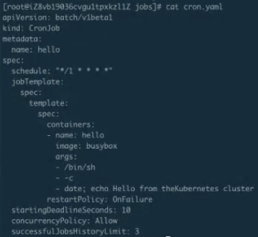- schedule :schedule 这个字段主要是设置时间格式,它的时间格式和 Linux 的 crontime 是一样的,所以直接根据 Linux 的 crontime 书写格式来书写就可以了。举个例子: */1 指每分钟去执行一下 Job,这个 Job 需要做的事情就是打印出大约时间,然后打印出“Hello from the kubernetes cluster” 这一句话;