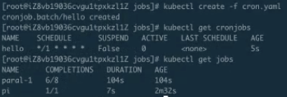 上图中可以看到突然出现了一个 job,“hello-xxxx”这个 job 就是刚才所说的 CronJob。它距离刚才 CronJob 提交已经过去 1 分钟了,这样就会自动创建出来一个 job,如果不去干扰它的话,它以后大概每一分钟都会创建出来这么一个 job,除非等我们什么时候指定它不可以再运行的时候它才会停止创建。