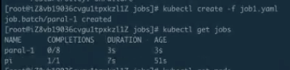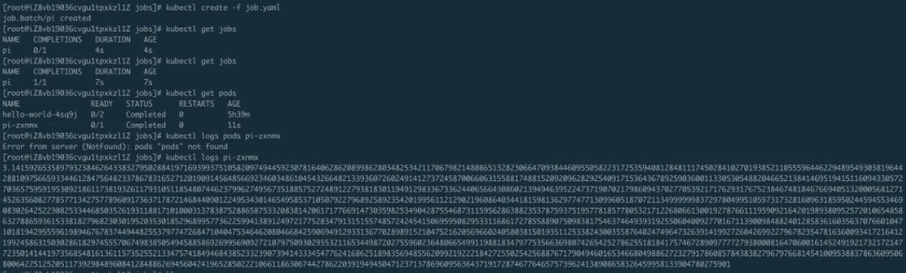 首先看一下 job.yaml。这是一个非常简单的计算 pi 的一个任务。使用 kubectl creat-f job.yaml,这样 job 就能提交成功了。来看一下 kubectl.get.jobs,可以看到这个 job 正在运行;get pods 可以看到这个 pod 应该是运行完成了,那么接下来 logs 一下这个 job 以及 pod。可以看到下图里面打印出来了圆周率。