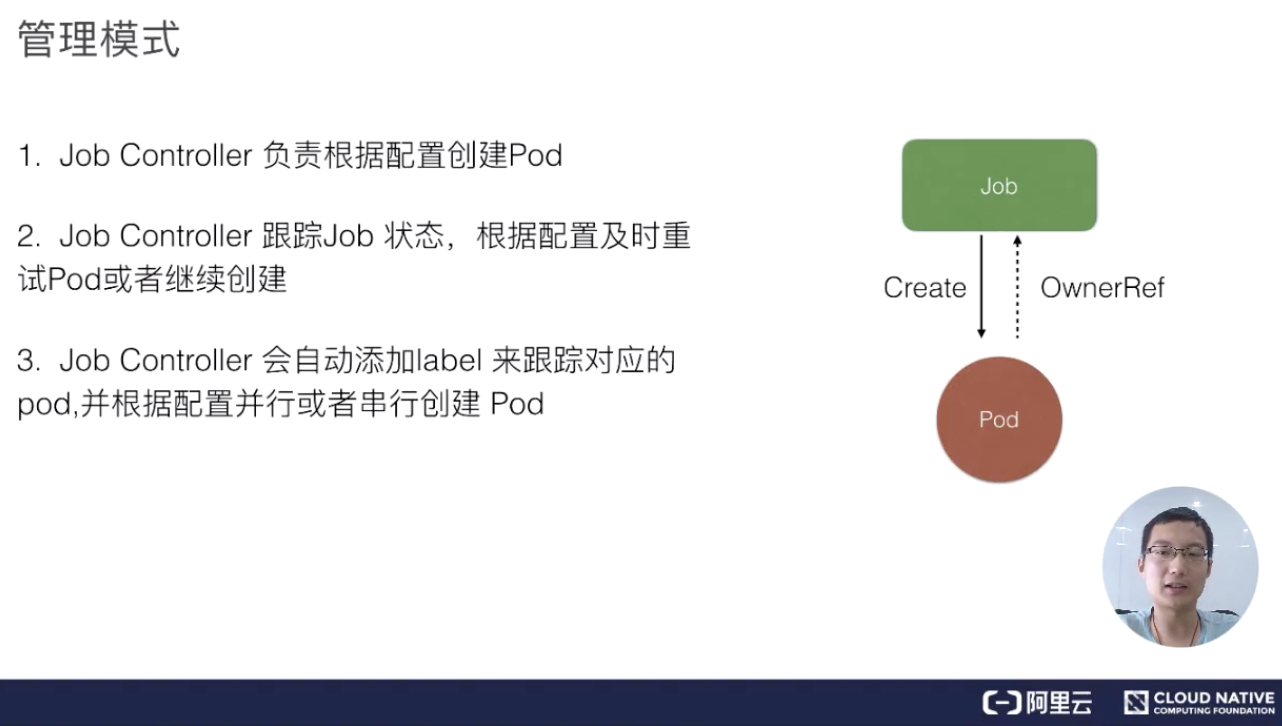 通过 Job Controller 检查当前是否有运行的 pod,如果没有的话,通过 Scale up 把这个 pod 创建出来;如果有的话,或者如果大于这个数,对它进行 Scale down,如果这时 pod 发生了变化,需要及时 Update 它的状态。