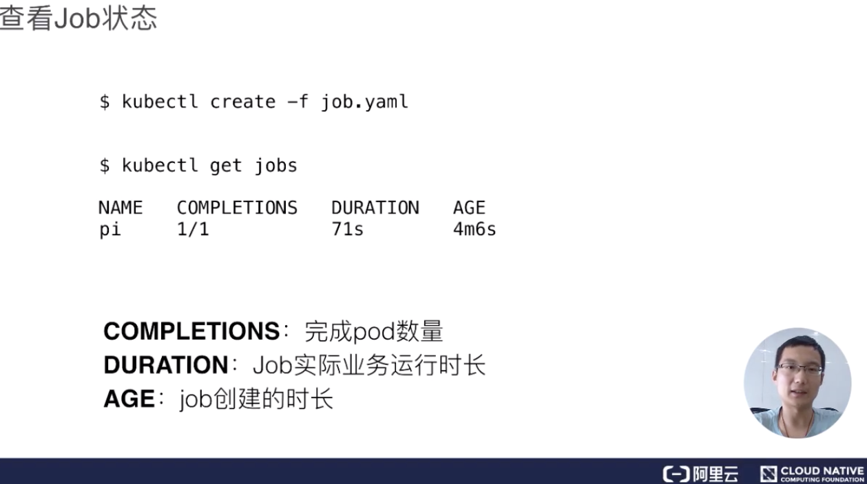 Job 创建完成之后,我们就可以通过 kubectl get jobs 这个命令,来查看当前 job 的运行状态。得到的值里面,基本就有 Job 的名称、当前完成了多少个 Pod,进行多长时间。AGE 的含义是指这个 Pod 从当前时间算起,减去它当时创建的时间。这个时长主要用来告诉你 Pod 的历史、Pod 距今创建了多长时间。DURATION 主要来看我们 Job 里面的实际业务到底运行了多长时间,当我们的性能调优的时候,这个参数会非常的有用。COMPLETIONS 主要来看我们任务里面这个 Pod 一共有几个,然后它其中完成了多少个状态,会在这个字段里面做显示。