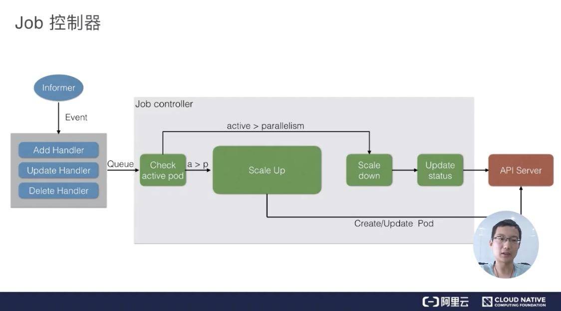 同时要去检查它是否是并行的 job,或者是串行的 job,根据设置的配置并行度、串行度,及时地把 pod 的数量给创建出来。最后,它会把 job 的整个的状态更新到 API Server 里面去,这样我们就能看到呈现出来的最终效果了。
