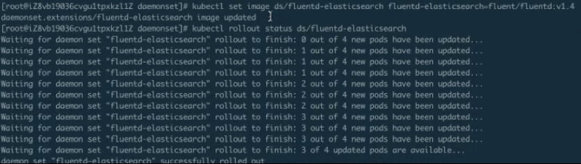上图中可以看到:DaemonSet 默认这个是 RollingUpdate 的,我们看到是 0-4,现在是 1-4,也就是说它在更新第一个,第一个更新完成会去更新第二个,第二个更新完,就更新第三个……这个就是 RollingUpdate。RollingUpdate 可以做到全自动化的更新,不用有人值守,而是一个一个地去自动更新,更新的过程也比较平滑,这样可以有利于我们在现场发布或者做一些其他操作。
