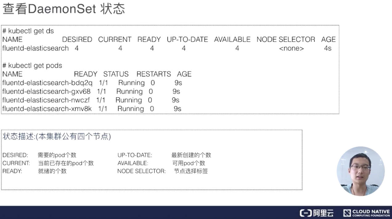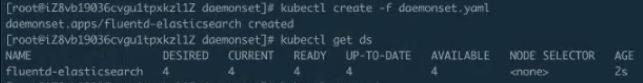 下面我们创建一下 DaemonSet ,然后再看一下它的状态。下图就是我们刚才看到的 DaemonSet 在 ready 里打出来的状态。