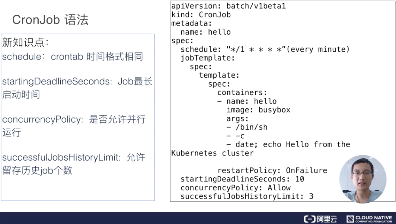 在这里 CronJob 其实主要是用来运作一些清理任务或者说执行一些定时任务。比如说 Jenkins 构建等方面的一些任务,会特别有效。
