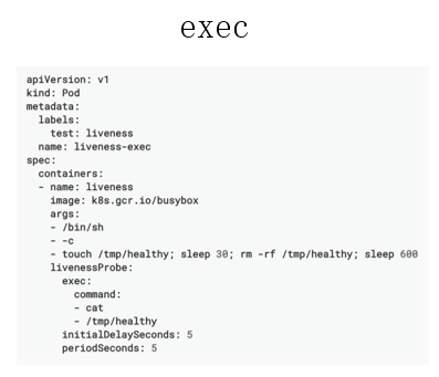- 第二种探测方式是 Exec。它是通过执行容器中的一个命令来判断当前的服务是否是正常的,当命令行的返回结果是 0,则标识容器是健康的;