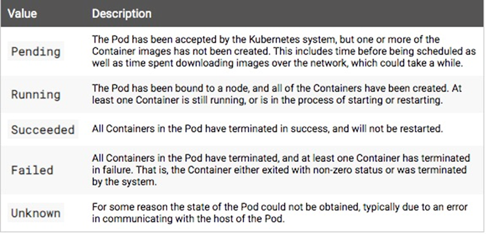 比如说上面的图,实际上是一个 Pod 的一个生命周期。刚开始它处在一个 pending 的状态,那接下来可能会转换到类似像 running,也可能转换到 Unknown,甚至可以转换到 failed。然后,当 running 执行了一段时间之后,它可以转换到类似像 successded 或者是 failed,然后当出现在 unknown 这个状态时,可能由于一些状态的恢复,它会重新恢复到 running 或者 successded 或者是 failed。