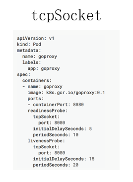 第三种是 tcpSocket,tcpSocket 的使用方式其实也比较简单,你只需要设置一个检测的端口,像这个例子里面使用的是 8080 端口,当这个 8080 端口 tcp connect 审核正常被建立的时候,那 tecSocket,Probe 会认为是健康的一个状态。