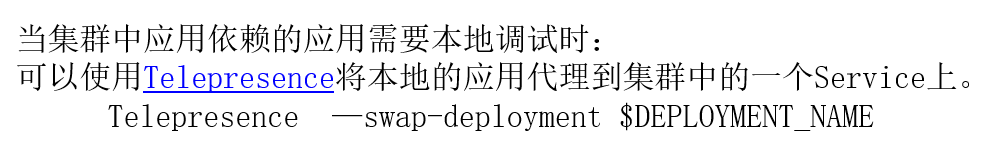 - 远程调试的一个策略,如果想把本地的应用代理到远程集群,此时可以通过 Telepresence 这样的工具来实现,如果想把远程的应用代理到本地,然后在本地进行调用或者是调试,可以用类似像 port-forward 这种机制来实现。