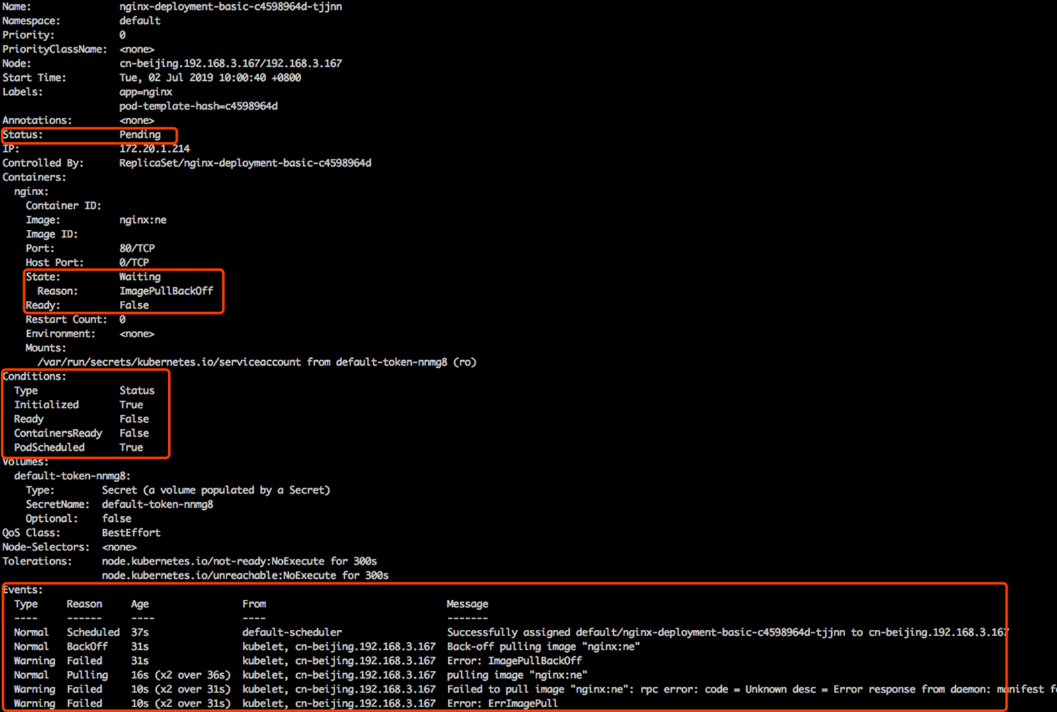 那可以通过相应的 condition 是 true 还是 false 来判断整体上方的这个状态是否是正常的一个状态。而在 K8s 里面不同的状态之间的这个转换都会发生相应的事件,而事件分为两种: 一种叫做 normal 的事件,一种是 warning 事件。大家可以看见在这第一条的事件是有个 normal 事件,然后它相应的 reason 是 scheduler,表示说这个 pod 已经被默认的调度器调度到相应的一个节点之上,然后这个节点是 cn-beijing192.168.3.167 这个节点之上。
