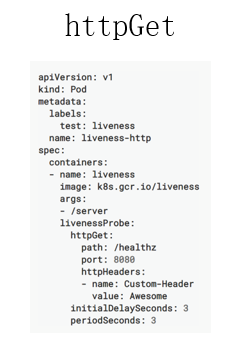 那再来看一下这个 httpGet,httpGet 里面有一个字段是路径,第二个字段是 port,第三个是 headers。这个地方有时需要通过类似像 header 头的一个机制做 health 的一个判断时,需要配置这个 header,通常情况下,可能只需要通过 health 和 port 的方式就可以了。