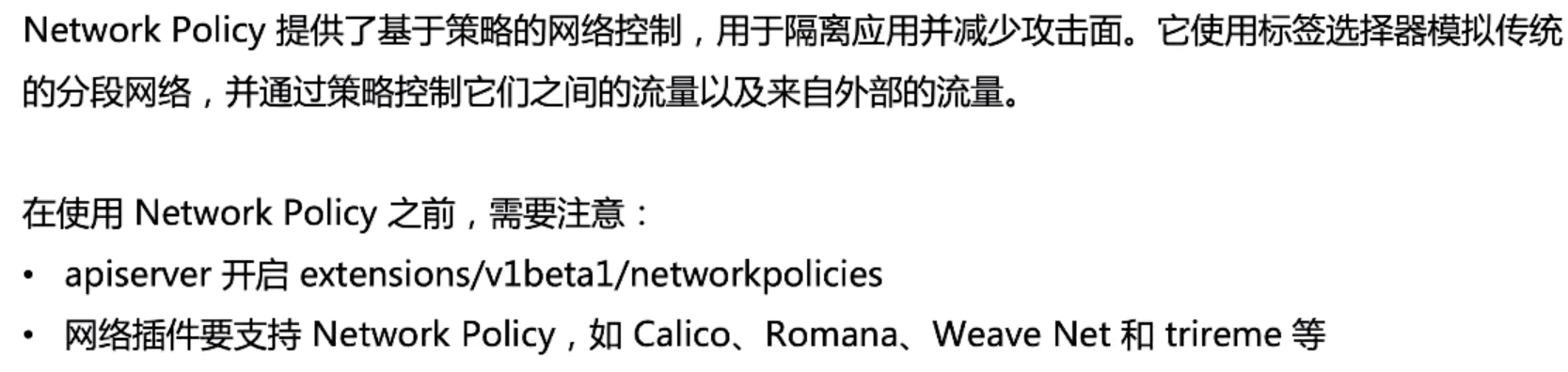 在使用 Network Policy 之前,如上图所示要注意 apiserver 需要打开一下这几个开关。另一个更重要的是我们选用的网络插件需要支持 Network Policy 的落地。大家要知道,Network Policy 只是 K8s 提供的一种对象,并没有内置组件做落地实施,需要取决于你选择的容器网络方案对这个标准的支持与否及完备程度,如果你选择 Flannel 之类,它并没有真正去落地这个 Policy,那么你试了这个也没有什么用。