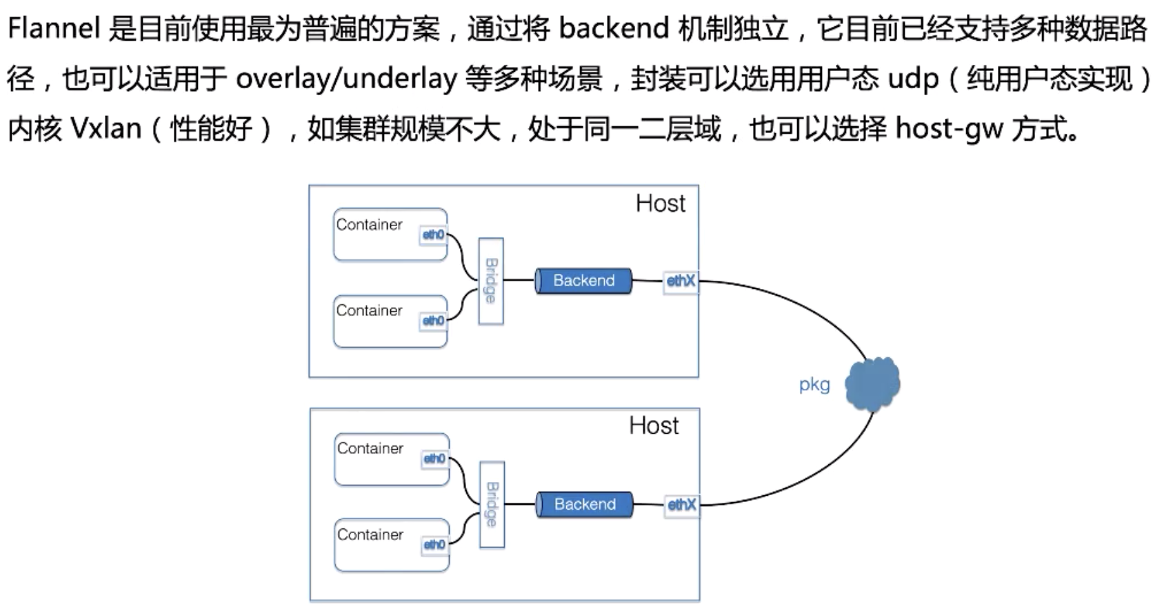- Flannel 是一个比较大一统的方案,它提供了多种的网络 backend。不同的 backend 实现了不同的拓扑,它可以覆盖多种场景;