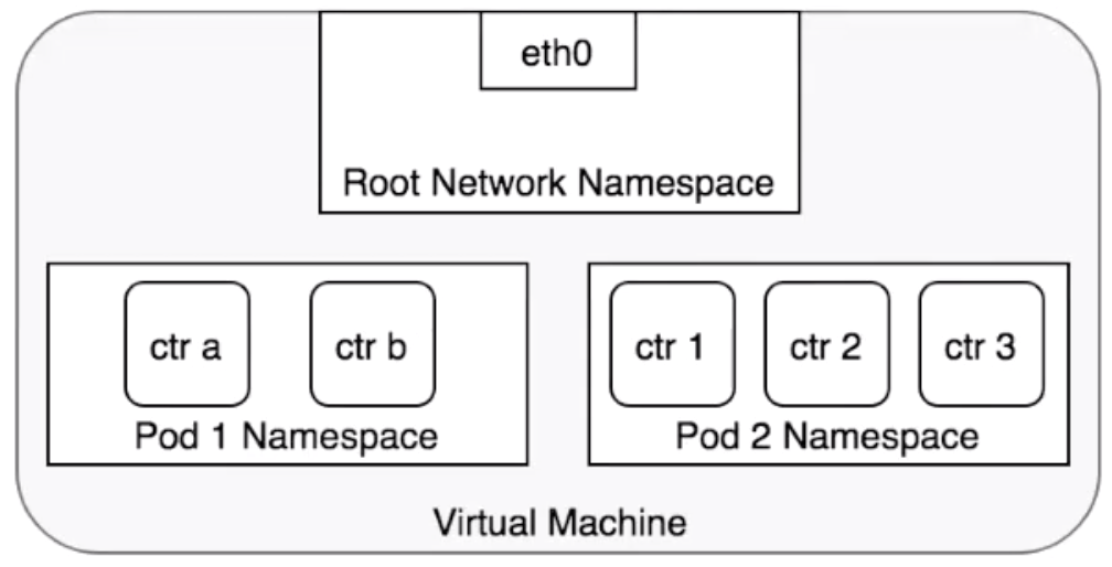 这张图可以清晰表明 pod 里 Netns 的关系,每个 pod 都有着独立的网络空间,pod net container 会共享这个网络空间。一般 K8s 会推荐选用 Loopback 接口,在 pod net container 之间进行通信,而所有的 container 通过 pod 的 IP 对外提供服务。另外对于宿主机上的 Root Netns,可以把它看做一个特殊的网络空间,只不过它的 Pid 是 1。
