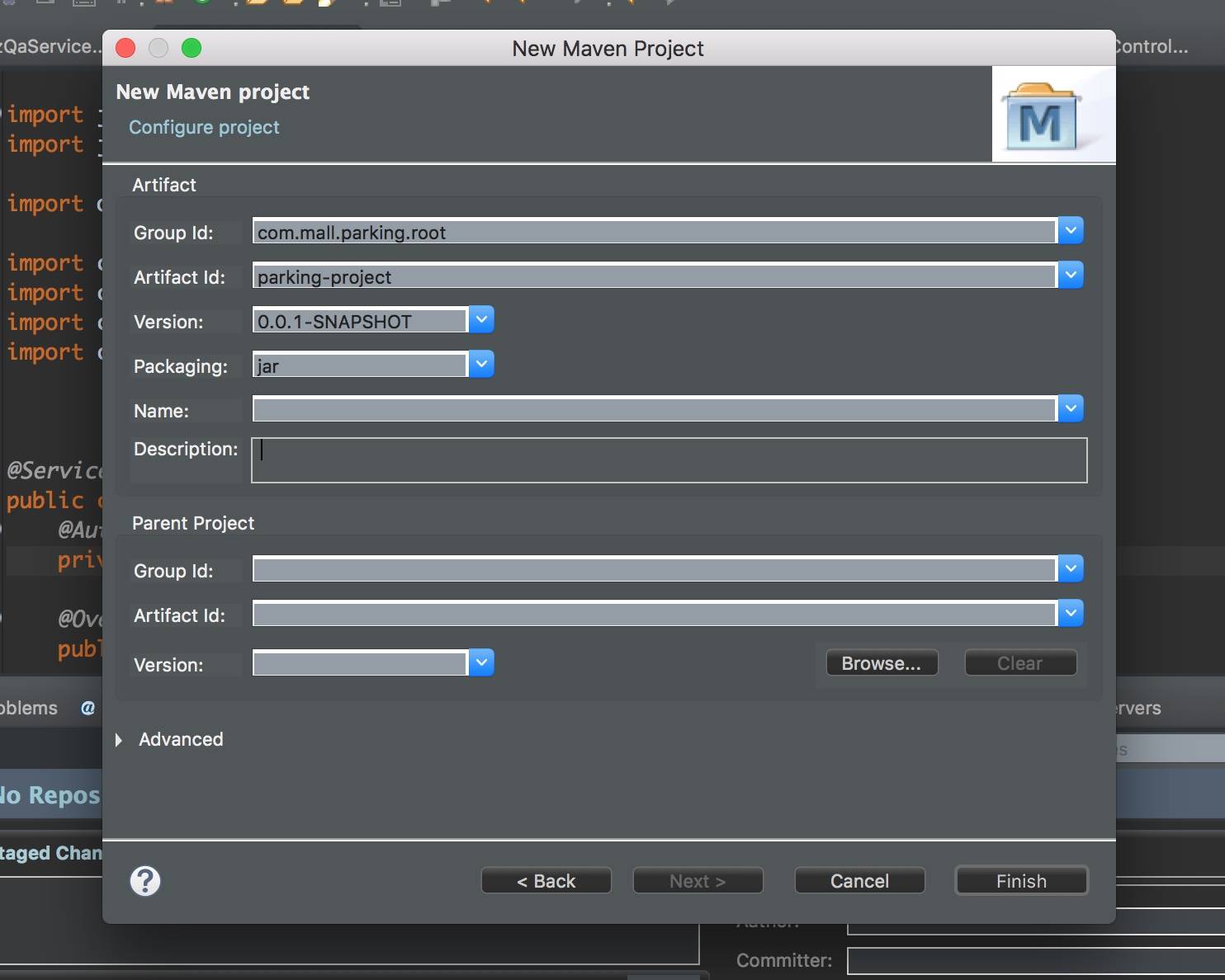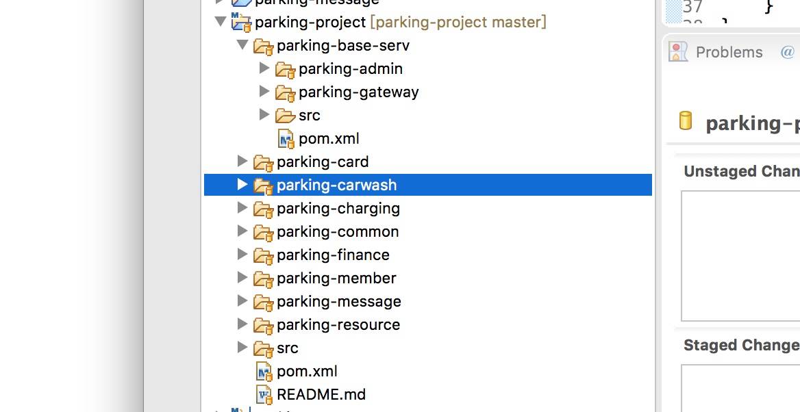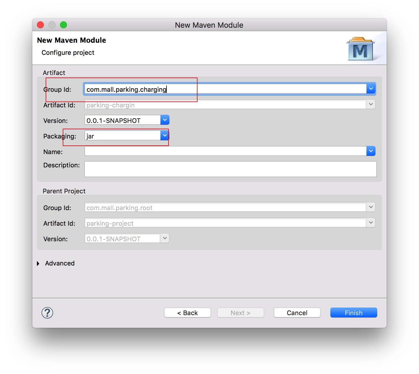 可以看到,子模块自动将 parent project 设置为 parking-project 父项目。由于是采用 Spring Boot 的方式构建子项目,此处选择 packaging 方式为 jar 。依此连续创建各种子模块即可,最终的结果如下: