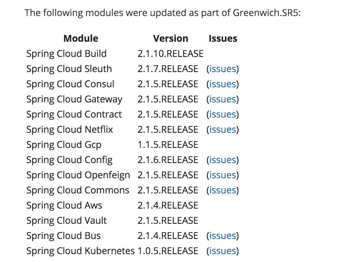 ( 某 Spring Cloud Greenwich 版本与子项目的版本对应情况 ) Spring Cloud 基于 Spring Boot 对外提供一整套的微服务架构体系的解决方案,包括配置管理、服务注册与服务发现、路由、端到端的调用、负载均衡、断路器、全局锁、分布式消息等,对于这些功能 Spring Cloud 提供了多种项目选择,可从官网的主要项目列表一窥端倪。