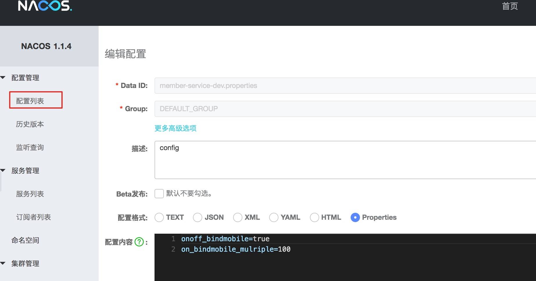 输入上文的约定的两个配置项,配置项可以应对多环境配置要求,在其它环境,建立对应的配置即可,输入 Data ID, 比如 member-service-prd.properties 或者 member-service-uat.properties,Group 采用默认值即可,当然如果需要分组的话,需要定义 Group 值,保存即可。