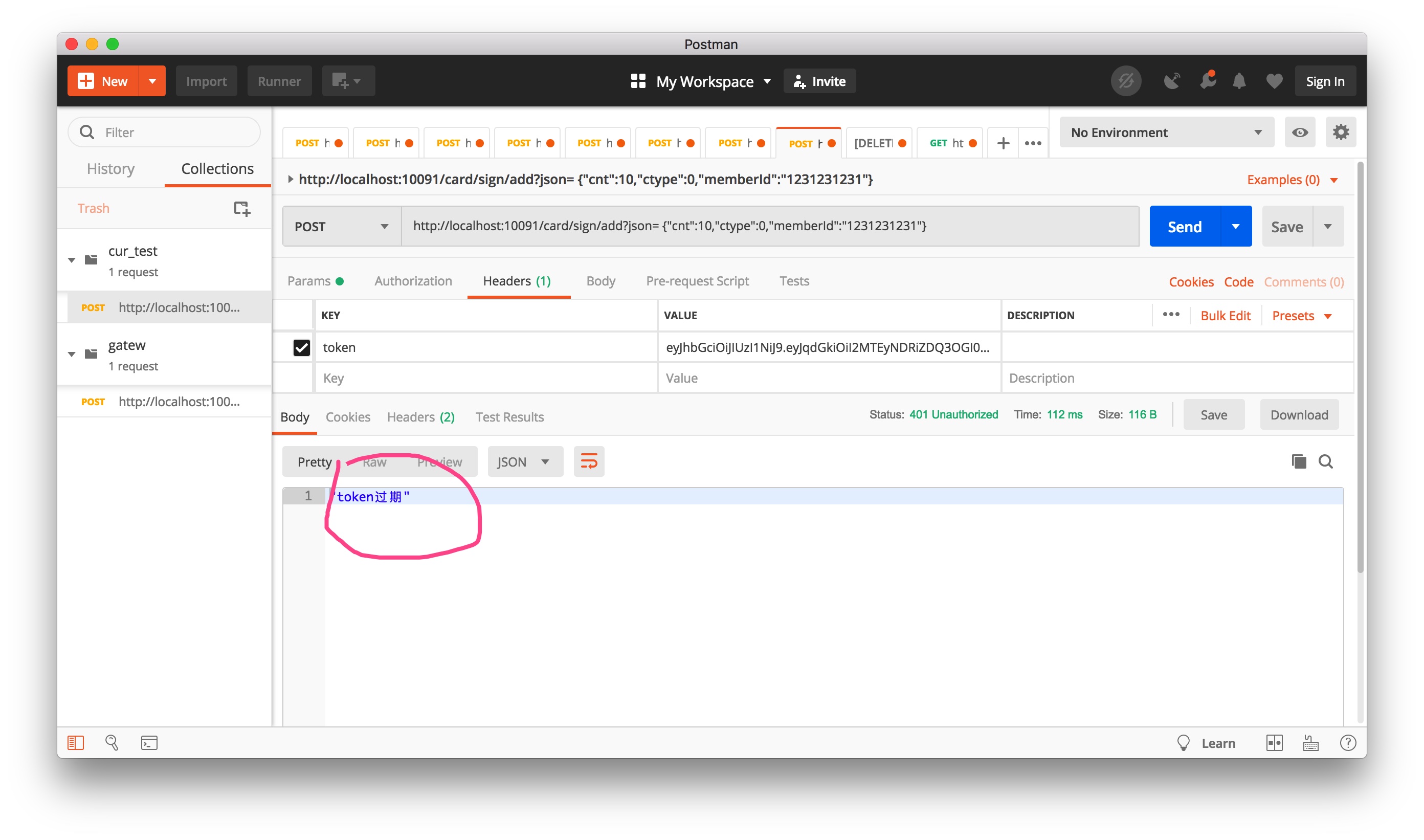 稍等数秒钟,待 token 自动失效后,再重新发起请求,结果如下图所示,请求直接在网关层被拦截返回,提示:“token 过期”,不再向后端服务转发。