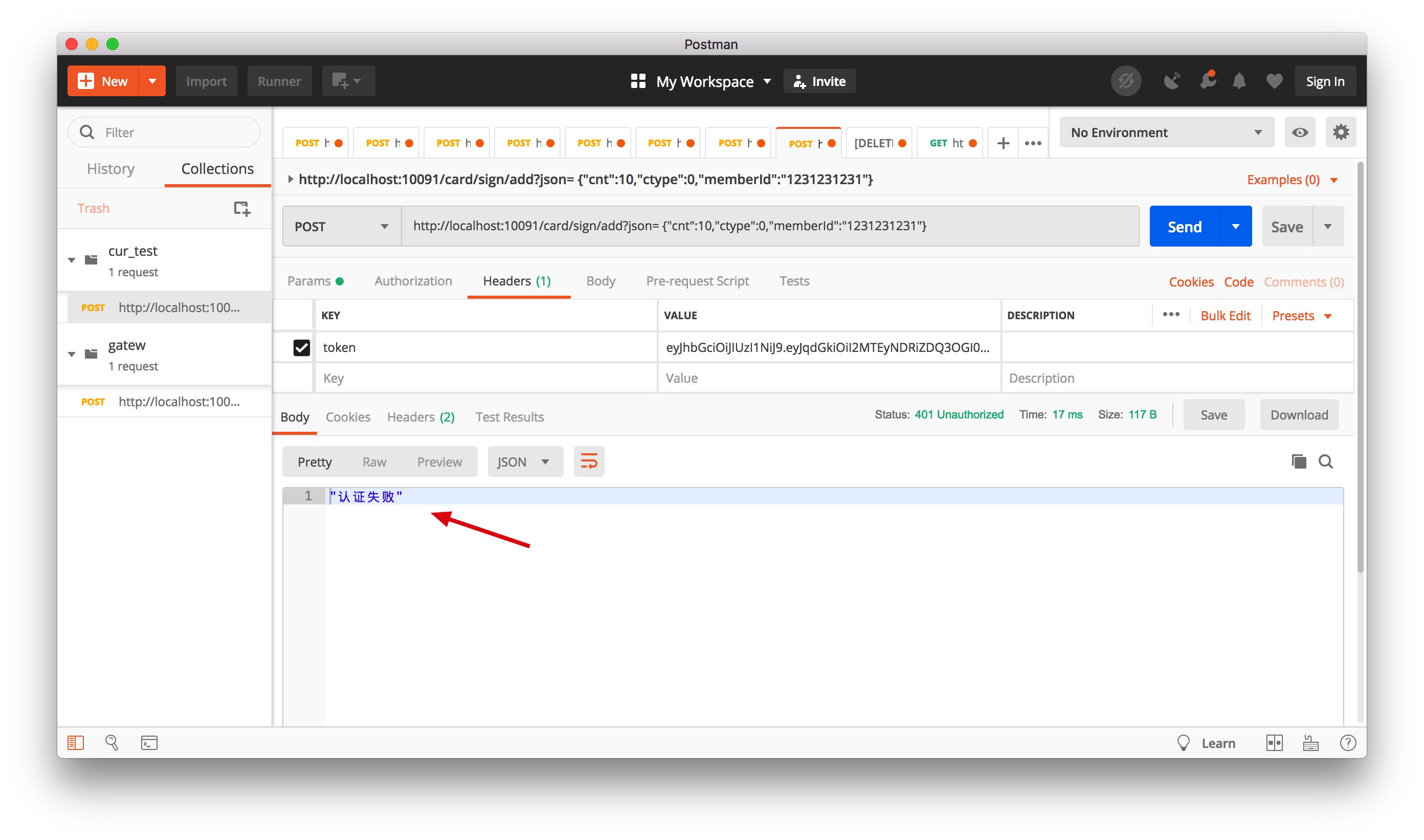 做另外一个测试:伪造一个错误的 token,进行请求,验证结果如下图所示,请求直接在网关层拦截返回,同样不再向后端服务转发。