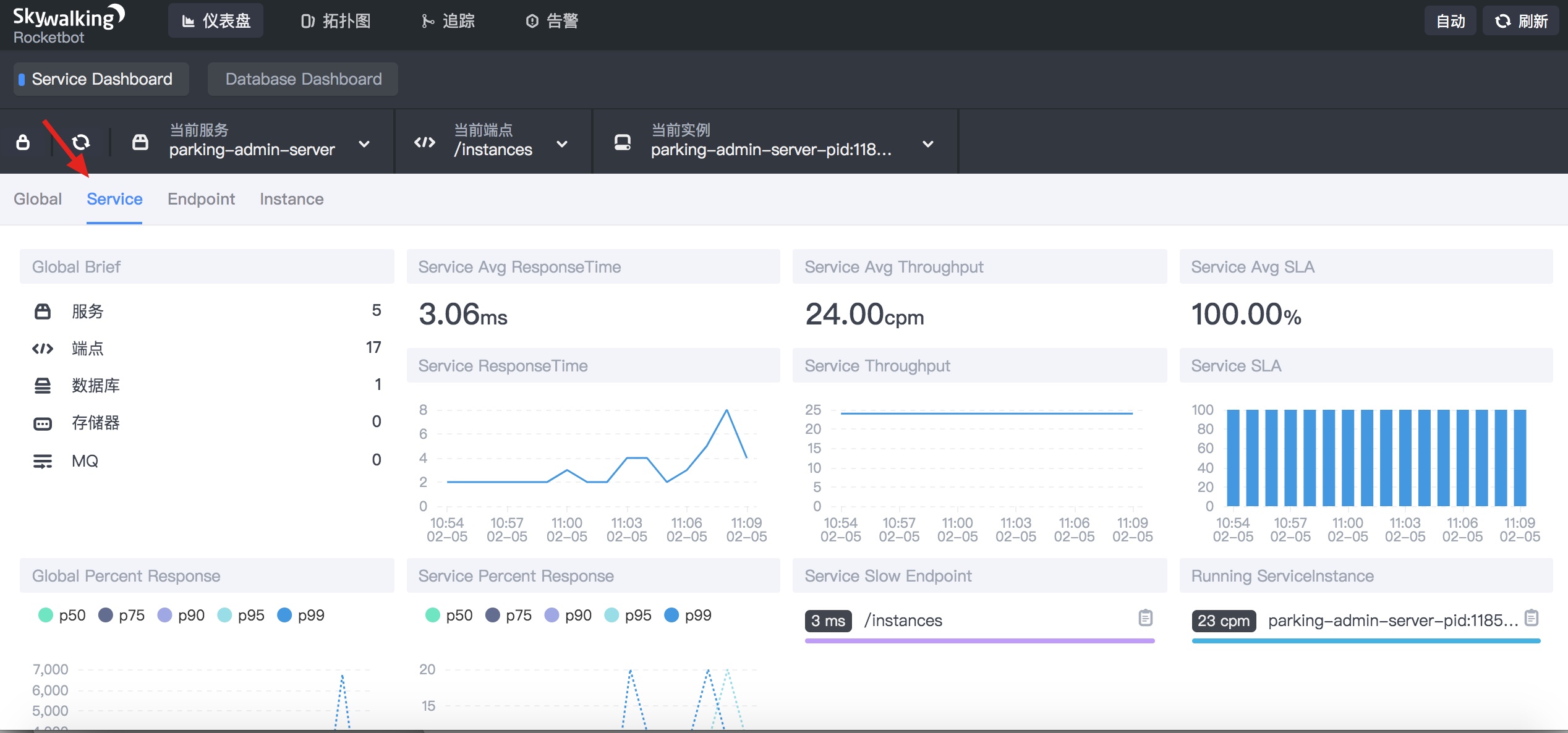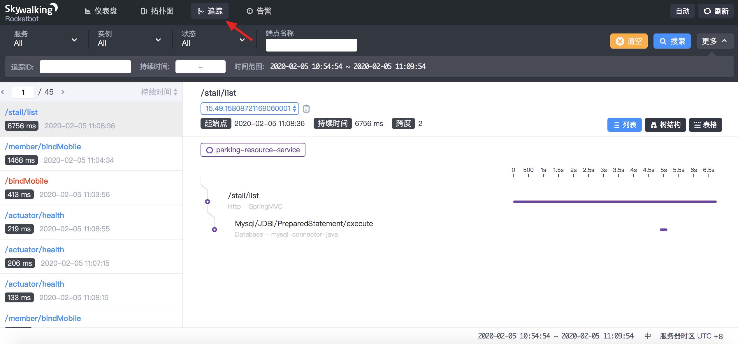 服务、服务实例、服务接口、数据库的性能监控,服务间的引用关系,服务接口的链路跟踪等等,都能从监控台找到相应的展现,我们这里重点关注下服务请求的链路跟踪。