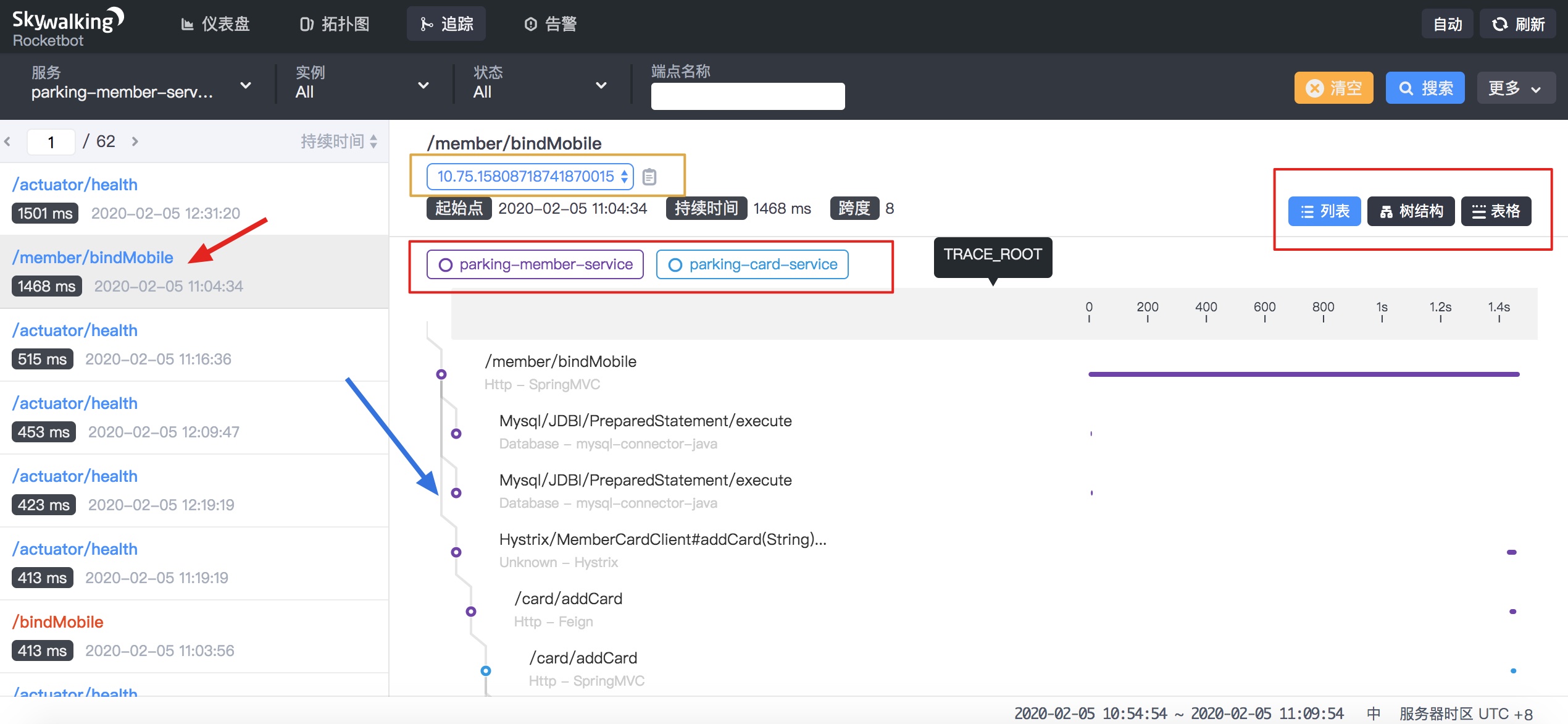 图中顶部棕色框圈住的部分是 traceid,什么是 traceid,这是一个全局的请求标识,从源头请求开始,中间涉及到的所有服务接口调用都携带此全局标识,用于标记这是一次完整的请求链路,通过这一 id 将所有请求串联起来,形成一个调用树,如上图中蓝色箭头所示的位置。