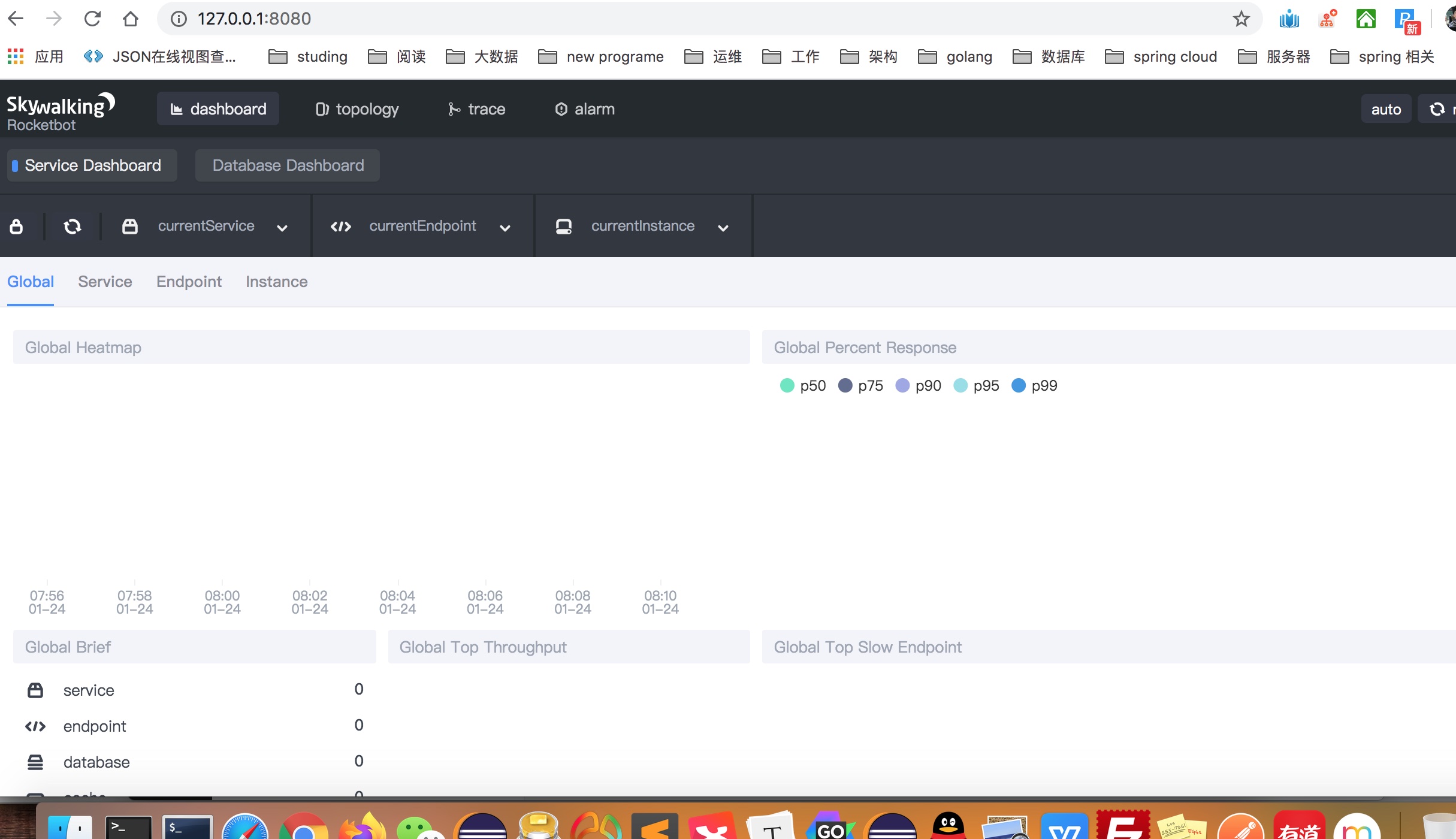 以上配置结束后,启动 SkyWalking,访问 SkyWalking 的 UI,http://127.0.0.1:8080 正常如下: