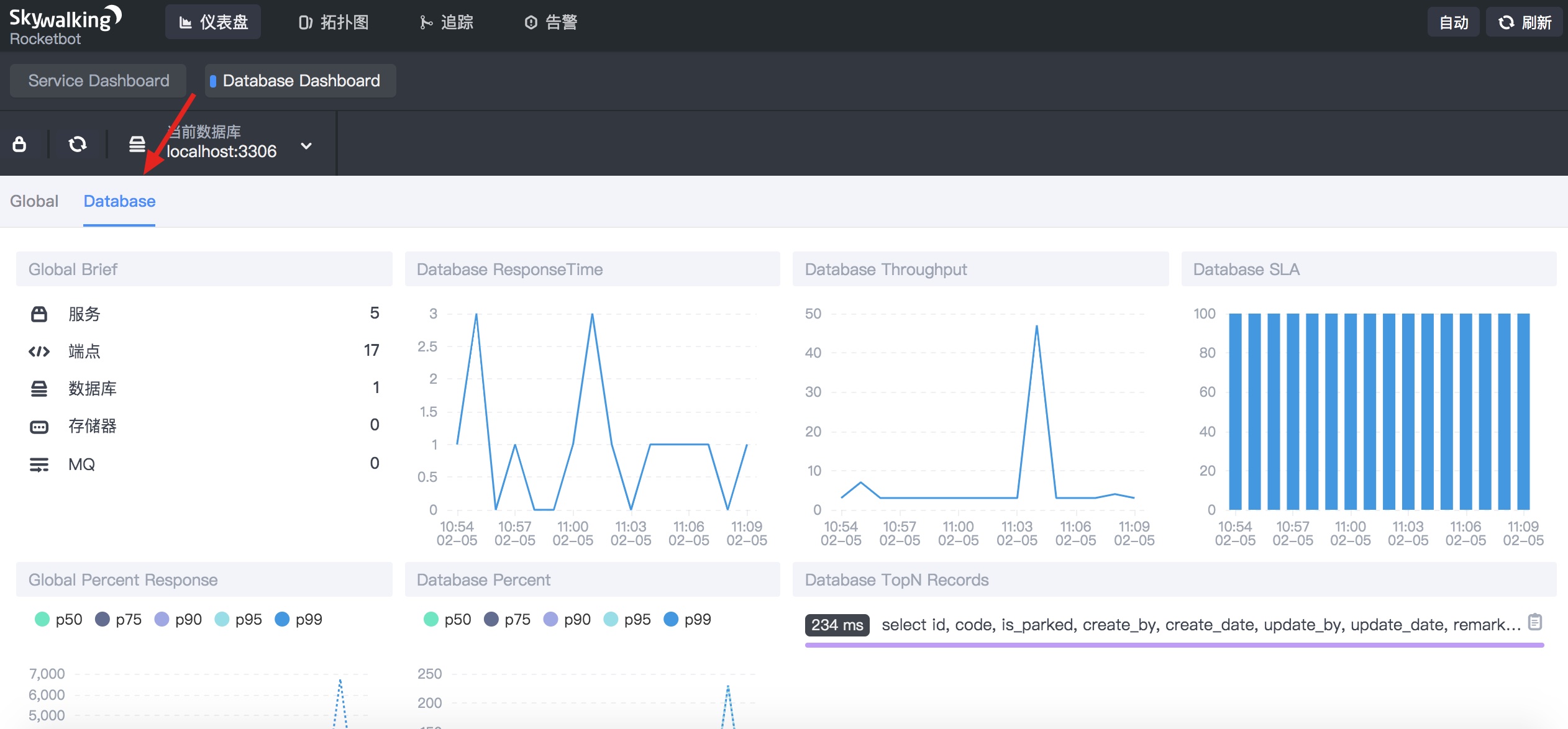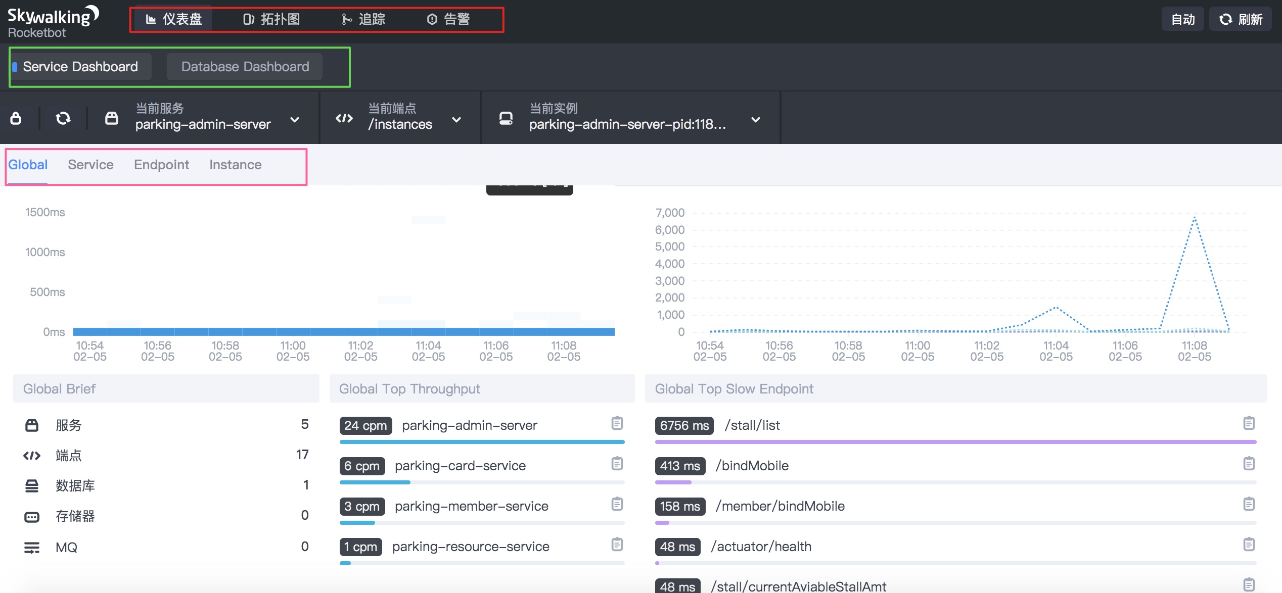 刷新 SkyWalking 的 UI 界面,可以看到已经有数据收集到。(重点关注图中彩色框框住的三个关键区域)